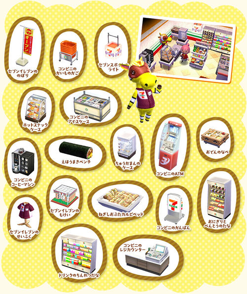 Para conseguir que Séptima aparezca en el juego, se debe visitar un establecimiento que cuente con conexión Nintendo Zone. En España se distribuye en las tiendas Game (del 9 de octubre de 2015 al 9 de enero de 2016), mientras que para conseguirlo en Japón había que visitar una tienda de 7-Eleven. Allí, una vez conectado a la red de la tienda, se debe iniciar el juego, subir al piso de arriba de la Inmobiliaria Nook y activar la New Nintendo 3DS XL que se encuentra encima de la mesa. Una vez descargado, Séptima visitará la plaza del jugador y le solicitará un encargo. Al aceptar la petición se desbloquearán los objetos basados en la tienda 7-Eleven para poder utilizarlos en el juego.