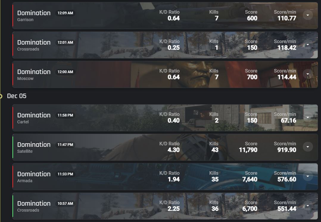 Espero subirlo poco a poco sea como sea StrifE83 escribió:Os comparto un listado de partidas sacadas de mis estadísticas de COD Tracker para que veáis el SBMM en todo su esplendor. Os prometo que mi intención no era hacer reverse boosting, simplemente es que tras hacer tres partidazas seguidas, las siguientes cuatro me ha puesto con profesionales que además debían de tener mucha mejor latencia que yo porque prometo que no me daba tiempo ni de disparar cuando entraban en mi campo visual. En una lobby de 12 jugadores para partidas de 6vs6, juro que éramos unos 7 de nivel 100. En una de ellas en Garrison no podíamos ni salir del respawn. Por supuesto no he terminado esas partidas; puedo aceptar jugar contra gente muy buena, pero gente muy buena con mejor latencia eso ya no.