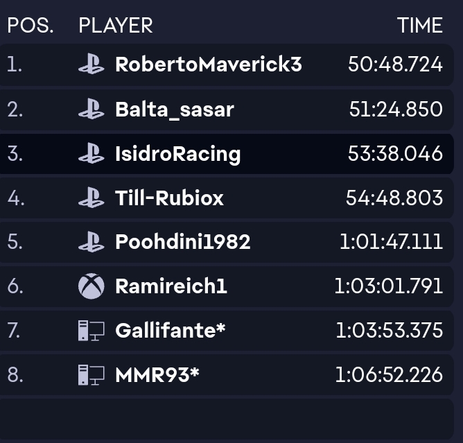 @cygnusx1 Que siga segundo después de lo mal que lo he hecho en los 2 últimos rallys es una cosa rarísima, pero bueno, con mas motivación para intentar hacer una buena participación aquí y tratar de mantener el segundo puesto porque lo que es