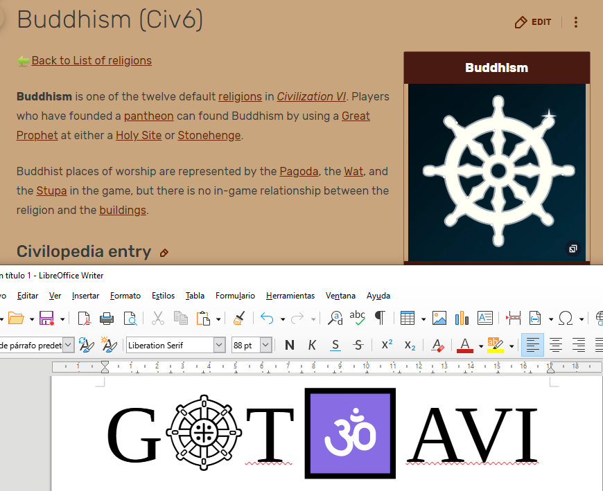 EDIT: Creo que lo podemos ir confirmando ya... No terminaba de encajar la pista del "G☸️T🕉️AVI". Pero tras ponerlo en un procesador de texto y ampliarlo, para comprobar que narices eran esos símbolos, pues...