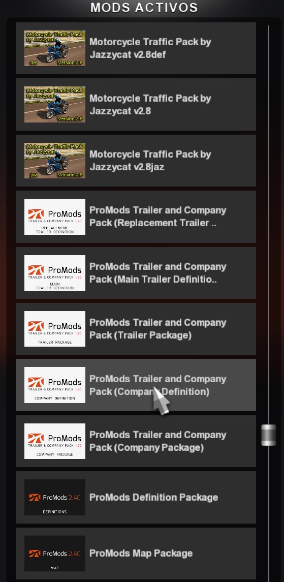 POWER இ escribió:Pillo sitio, vengo de Forocoches. Adicto a los mods de ETS2 en el que llevo ya casi 2.000h y suelo ir probando mods, a la vez instalados cerca de 400 y me cuesta ir seleccionando.