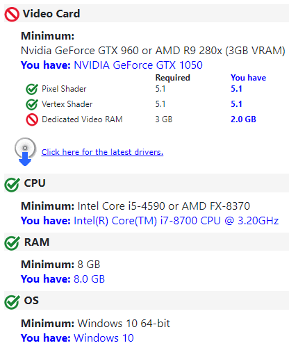 Rock_Arm escribió:Pablo Motos escribió:Hola, soy nuevo en el foro y no se si se puede preguntar cosas técnicas en este hilo, pero quería saber si mi pc puede correr el juego, he buscado en Can you run it? y me sale esto (os dejo la foto), me pone que no podría por que tengo 2gb de ram de video y el mínimo es 3. No me gustaría comprarme el juego y después no poder jugarlo.