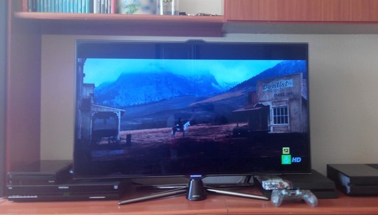 Aquí se ve la PS2 fat, pobrecilla que ha tenido mucho trote y muchas hostias..., y la Dreamcast y la X360 (con el muelle jodido), ambas se las compré a compañeros de aquí del foro. También se ve un PC. Es de estos tipo oficina, me salió bien de precio y le metí Win7; la idea es usarlo de media center, aunque quizás lo muevo para la tele del comedor que la Samsung puede leer pelis desde un pendrive.
