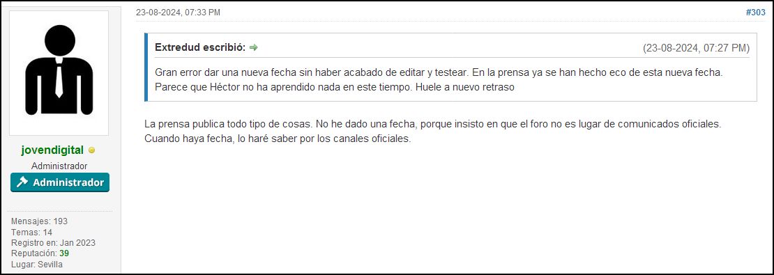 El problema es que luego ese mismo día se desmintió a sí mismo:La prensa publica todo tipo de cosas. No he dado una fecha, porque insisto en que el foro no es lugar de comunicados oficiales. Cuando haya fecha, lo haré saber por los canales oficiales.