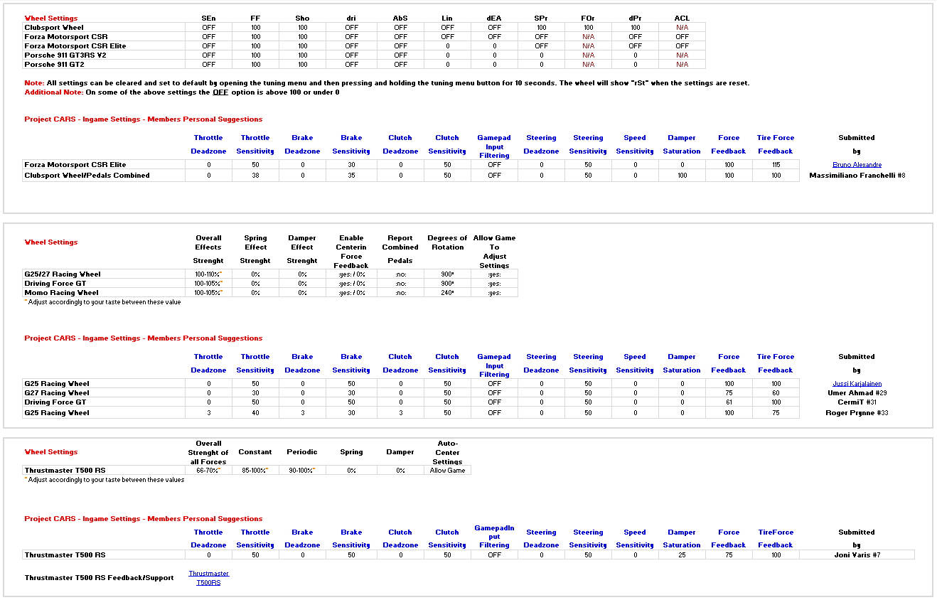 Adjunto configuraciones de force feedback que se recomendaron para Project Cars (según volante) en WMD. Son de las betas y no lo he probado aún así que no puedo deciros más, pero si os sirve para mejorar el ffb...