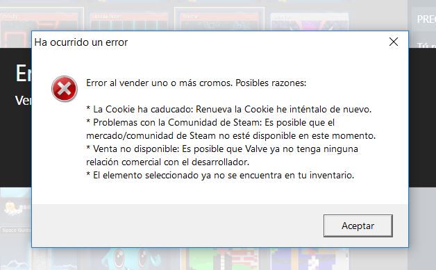 Buenas, buscando en Internet una alternativa para vender cromos llegué hasta esta página, decidí probar la aplicación pero tengo el mismo problema que el usuario @Torvicxs, ejecuto la aplicación y ni bien le doy click a un cromo la aplicación se cuelga y se cierra, probé con diferentes cromos, de diferentes juegos y el resultado fue el mismo, inclusive pensé que era por la cookie así que usé el método de logeo pero fue igual, accedí, click a un cromo y crashea. Espero se pudiera darle una solución ya que he probado con otras alternativas como Steam Inventory Helper, pero hay una función en esta aplicación que llamó mi atención, la de poder selecciona diferentes cromos y asignarles un valor de venta personalizado igual para todos, en Steam Inventory Helper, al menos hasta donde sé no se puede hacer eso de asignar un valor personalizado a una tanda de cromos y sus funciones de venta rápida e inmediata no me atraen, por lo que espero se pueda solucionar este error.