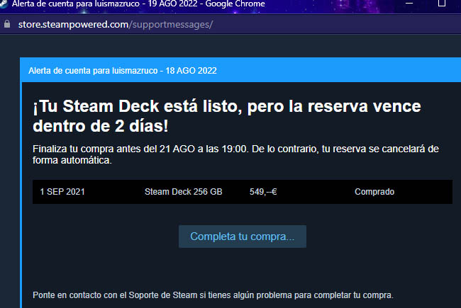 Tu Steam Deck está listo, pero la reserva vence dentro de 2 días!