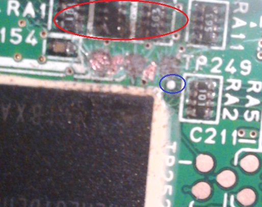 reza por que sea simplemente que la pista esta abierta en el circulo azul aunque en esa foto parece que esta bien, por que el estado de los otros pads es catastrofico, y no se si es la foto, pero me extrañaria que alguno de los componentes del circulo rojo estubiese quemado.