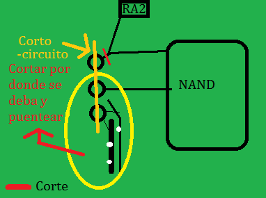 Ahora,lo que tendría que hacer es,para empezar,ignorar el DAT0 roto,dado que el circulito está perfecto y si da problemas,cortarle el saliente de pista hacia el testpad tal que así:El adjunto Sin título.png ya no está disponible