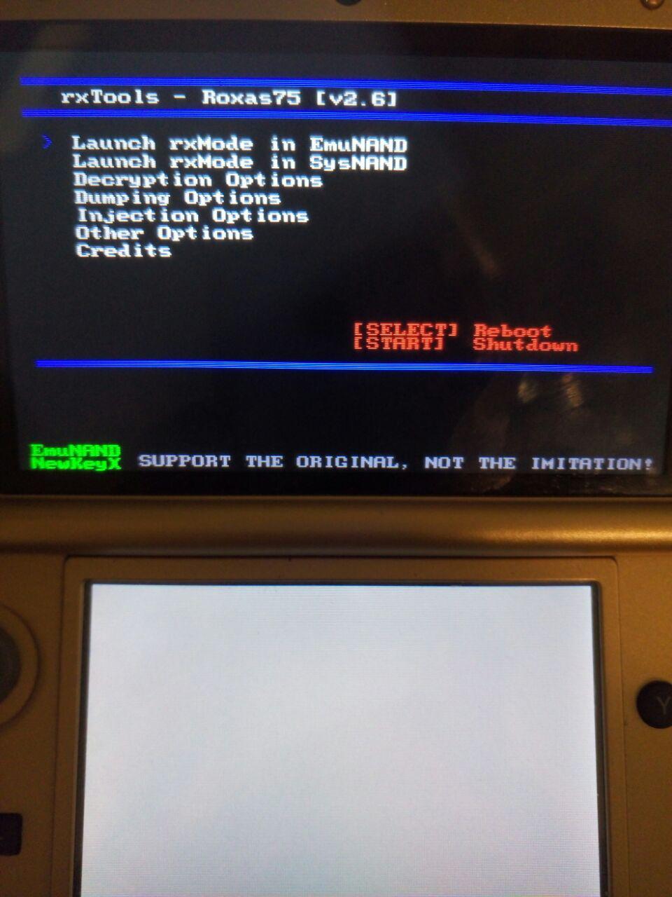 probe borrando todas las carpetas excepto la de 3ds y volviendo a instalar el rxtools y ahora me deja entrar y navegar en el menu de rxtools, pero cuando intenta cargar la emunand se queda colgado (espere 5 minutos, asi que supongo que si que esta colgado)