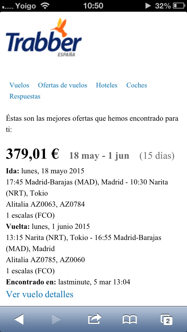 Esta semana me han llegado al menos dos mails de Trabber (una web de estas que te buscan vuelos con el rango de precio y tiempo que quieras - yo lo tengo a un máximo de 520, y entre 9 y 16 días; y para que me lleguen a diario) con vuelos i/v por 370-380€