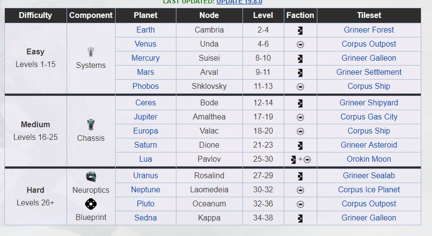 Te paso la lista de donde cae cada pieza, es ir haciendo misiones de espionaje para cada pieza (neuropticas, chasis, sistemas y plano) hasta que te caigan, cuando tengas todo lo montas en el banco de trabajo y ya esta. Todas las piezas caen exclusivamente en rotación C, lo que significa que tienes que extraer los tres datos sin fallar (A, B y C) y tener suerte. Te pueden caer a la primera o que pasen días y no salgan. Y ya esta, es un frame bastante fácil de sacar, no tiene mayor misterio.