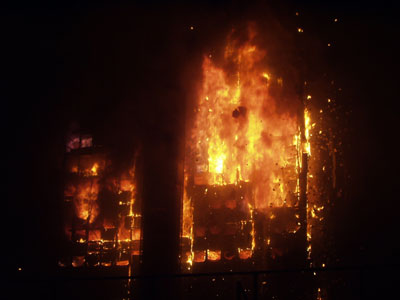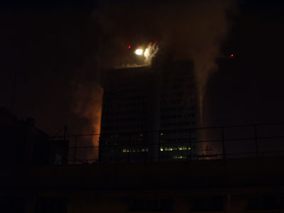 En un primer lugar se ha empezado quemando sólo una esquina del edificio, que se ha vencido encima por el calor. A pesar de la distancia, se oía perfectamente un "rumor" de llamas, y el crepitar del fuego. Cada vez que la estructura del edificio crujía, automaticamente se desprendía una parte de él. A partir del primer derrumbamiento grande (sobre la 1 o así), el fuego se ha extendido rápido y ha pasado al resto de fachadas del edificio, extendiéndose desde la planta en que había empezado hacia abajo. Quizás lo más espectacular es que, al producirse el fuego a tanto nivel de altura, eran incapaces de llegar a echar agua, los compresores no generaban tanta fuerza como para subir el agua unos 70 metros (aproximadamente la altura inicial del edificio).