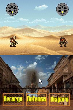 El juego seria una especie de duelo entre dos personas... puedes elegir entre atacar, recargar o defender en cada turno.. y segun lo que elijas tu y la maquina sucede una cosa o otra.. el juego termina cuando uno de los dos muere.