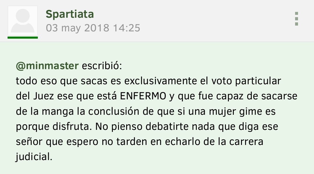 Spartiata escribió:ubn escribió:@Spartiata No se puede opinar correctamente de lo que pasó porque no se tiene el sumario, ni se asistieron a las vistas, pero el juez es un enfermo porque tú lo dices, y no hay más que hablar. Qué nivel.