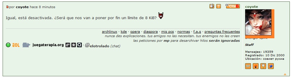 Scylla escribió:Para el próximo Día de los Inocentes se publicará un aviso de que podremos poner avatares de alta resolución y firmas kilométricas. El que lo haga se lleva un avatar de Rick Astley y el vídeo de la canción como firma