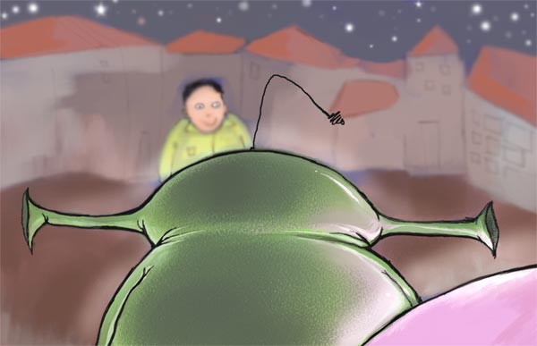 Antonio no tenía amigos porque no los veía, pero una noche en el bosque le sucedió algo extraño. Empezó a soplar el viento, y una luz muy intensa le sobresaltó. Escuchó ruidos electrónicos, y olió a quemado. Asustado, se dispuso a volver a casa, mientras el viento soplaba y soplaba.