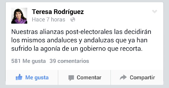 Hoy de nuevo, viendo en streaming el acto en Córdoba, Trending Topic otra vez en Twitter y lleno de gente. Da gusto escuchar a Errejón. Da gusto escuchar a Teresa Rodríguez. Se nota que son gente distinta, normal y corriente y con muchas ganas. Cada día que pasa más ilusión me haría que Teresa llegara a ser presidenta de la Junta. Sería maravilloso.