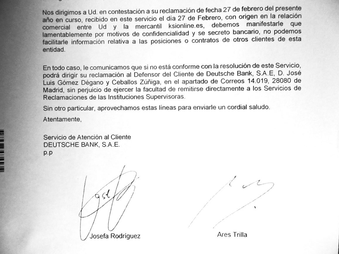 Me acaba de llegar por correo la respuesta del Deustche Bank a la reclamación que les puse.