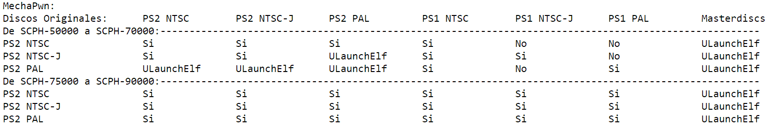 edito que se me olvidaba el exploit Fortuna, este permite ejecutar archivos elf en cualquier consola que no sea compatible directamente con FMCB, incluso cargar FMCB, Ulaunchelf, etc, se puede utilizar para lanzar el Ulaunchelf y desde este los discos en formato Master Disc