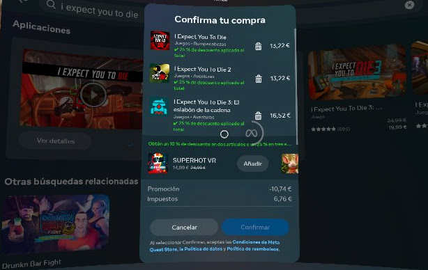 xaviwan escribió:Gracias nuevamente por la captura y el tutorial.metallah escribió:Entras desde las gafas en la Store de meta. Buscas un juego que te interese y pinchas en el precio como si lo quisieses comprar. Al hacer eso te salta una nueva ventana con el juego que has elegido y, juste debajo del juego que has puesto, te aparecen los juegos que puedes añadir para que te hagan ese descuento. Esa es la captura que he puesto más arriba.