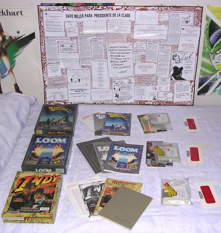 Ahí van las fotos, la primera de las 3 primeras joyas de Lucasfilm, el Maniac Mansion, el Loom y el Indiana Jones y la última Cruzada. Todos completos, libros de pistas incluidos, el Maniac Mansion con un poster que simulaba un corcho de clase con papeles... y el Indy 3 con el Diaro del Grial de Henry Jones... la caña! ^_^