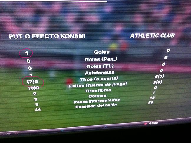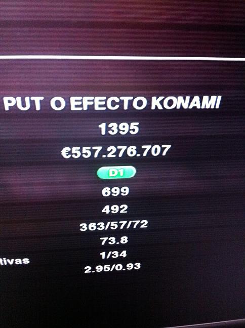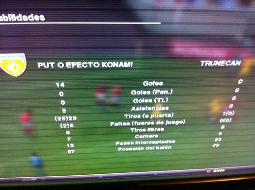 Acabo de jugar yo un par de partidos y he ganado los 2, he jugado un partido siendo muy superior el tio me ha llegado 2 veces contadas, en 10 min. y yo le he llegado 17 veces, y solo le he podido meter 1, he ganado 1-0 a un equipo de castolos, luego a uno que tenia gente de 80 mas o menos, milito, hamsik y esa gente, he tirado 8/8 tiros a puerta y le he clavado 6-0 asi que vosotros vereis si hay efecto konami o no, el tio este al que le e metido 6 ha sufrido el efecto konami porque fallaba todo hasta se regate a mi portero y va un jugador suyo y hace una rabona y falla, jaja. puto efecto konami [jaja]
