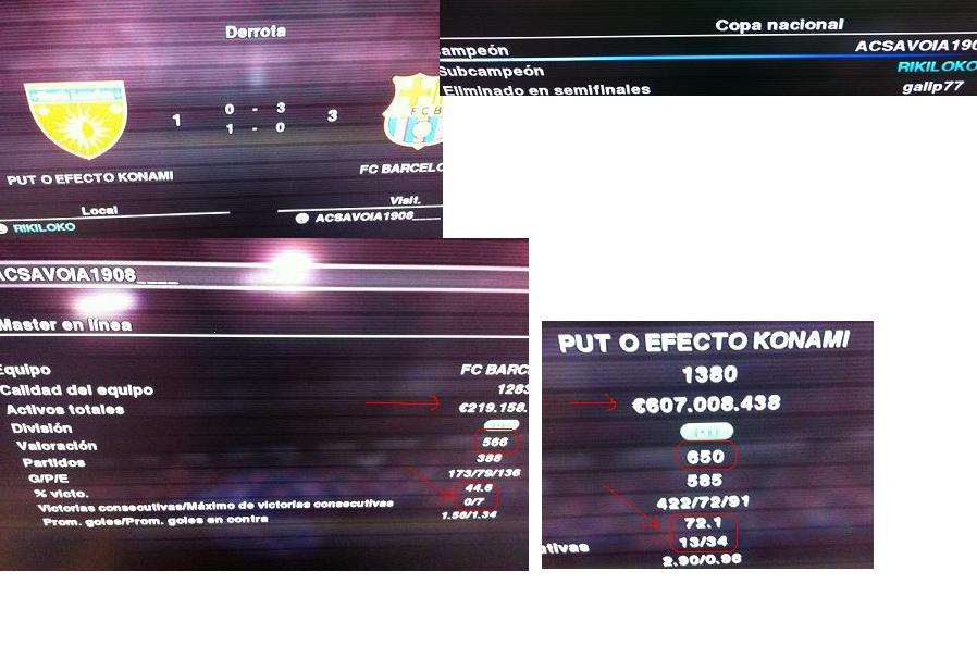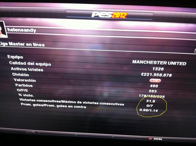 Por mi forma de jugar puedo ganar o perder, pero hay cosas que no alcanzo a entender y pongo un par de fotos de un tio que me empató 2-2 en un torneo en el 3 partido, llevando yo 9 goles de golaverage, y jugando un partido en el que iba 2-0 ganando facilmente, me relajé?? pues no, jugué consciente de que no podía fallar porque me clasificaba isofacto. Y se inventa una contra del rival, teniendo yo en mi campo a Puyol,Pique,Cambiasso y Neur tambien falla porque estaba ligando con una chica de la grada del fondo y no se entera de que viene un único tio contra 7 mios (2-1). Ahora viene lo mejor, min 89, había gastado los cambios en mis defensas (los más cansados) para que nada fallara, el tio no tenía ni un recambio para su delantera, pues pisa el area se cae y penalti (2-2) y pita. Se te queda una cara de tonto pensando tan mal defiendo que no soy capaz de evitar que me metan dos goles en un partido a 5 min en la segunda parte contra un tio que gana un 31,6% de los partidos que juega y lleva en 563 partidos de media 0.98 goles ?? Son cosas que se escapan a mi entender.