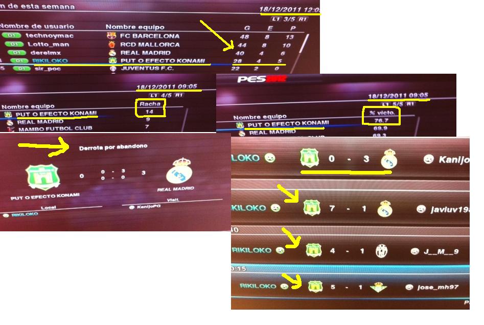 Harto de llorar y desahogarme en el Post de mis compañeros LIGA MASTER ONLINE PES2012 y ellos más cansados aún de leer mis lamentos me decidí a empezar con mi tesis y apuntar los partidos que jugaba cada día desde el Martes al Lunes que es cuando acaba el periodo de clasificación de ranking. En esto he tenido un fallo y es que a pesar de que le he echado fotos a mis números cada vez que daba por concluido el día no lo hice con el ranking semanal ( en el que se incluye los partidos que jugaste en esa semana y tus G/E/P junto con la racha máxima conseguida ) ya que no contaba que el lunes me iba a topar con tanto emulero y gente que cancelaba el partido con lo cual desgraciadamente el Martes no estaba en el ranking de la semana anterior ( por que me quedé en un 70%) así que se me fastidió lo más importante de mi estudio que es poder deciros mi puesto exacto en el ranking para que pudierais comprobar mis números reales en la semana y no tan solo fiaros de mi palabra. No contaba yo que precisamente el Lunes iba a desaparecer del ranking por causas ajenas. Y nunca le hice una foto a esa clasificación puesto que no la iba a utilizar hasta el último día en el que saliera el total de los partidos jugados.