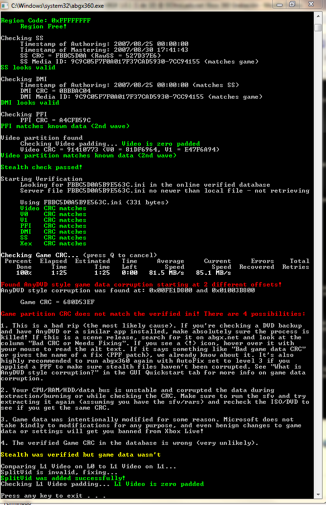 ghengiskhan escribió:yo tengo una pequeña duda, yo hago mis copias de mis juegos, no los descargo , introduczo el dvd en la consola, lo instalo en el disco duro, despues uso el lector del pc Sh-d162D con el xbox backup creator , en algunos juegos cuando los paso al disco duro del pc y uso el abgx me indica esto en amarillo