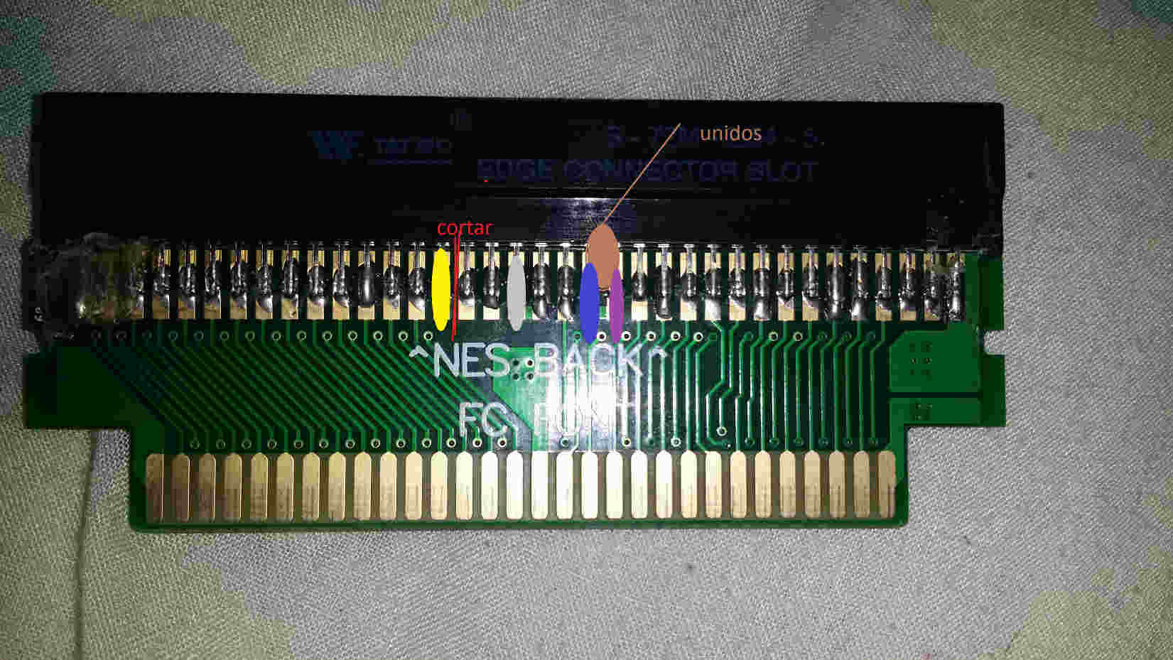 decir que es el único adaptador que tengo de fami a nes, pero los 3 que tengo de nes a fami tienen distintas configuraciones de pines ( en ellos me basé para arreglar este) con distintas configuraciones me refiero a qeu en uno viene pines sueltos, en otro están puenteados entre si , y cosas asi, referentes siempre a los mismos pines.