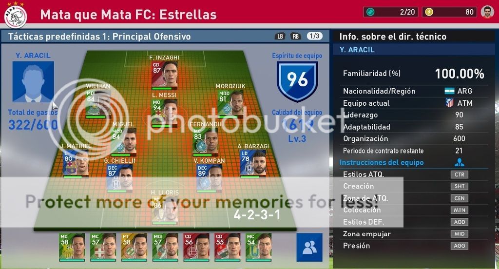 Messi (sacado de representante de 2 estrellas O_O): Empezó con muchas dudas, la primera semana que lo tuve estaba con flecha roja pero no marcaba diferencias. No es tan rápido y se suele cansar antes de lo que debería, por lo que rinde bien un tiempo nada más. Técnicamente debe ser el mejor del juego, pero no debo haber encontrado su lugar en el campo. Lo probé como MDI y MDD y no hubo caso. Ahora lo tengo como MO y mejoró, pero no destaca lo que dice su valoración. Me funcionaba mejor Totti, pero no me animo a volver a ponerlo y sentar a Messi, la verdad. Al menos cuando está en el cancha el rival hace todo lo posible por pararlo (marcas desesperadas, patadas de todos los colores etc), al recibir tanta atención siempre algún compañero se ve beneficiado, razón por la cual indirectamente me está sirviendo.