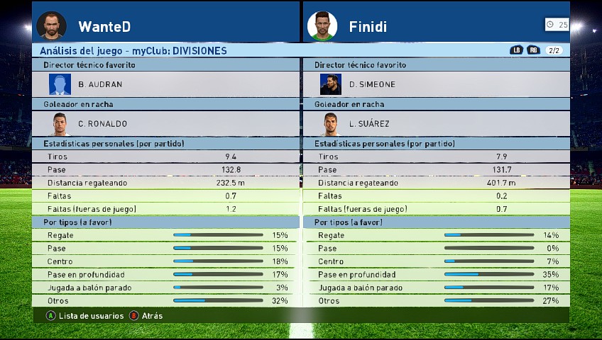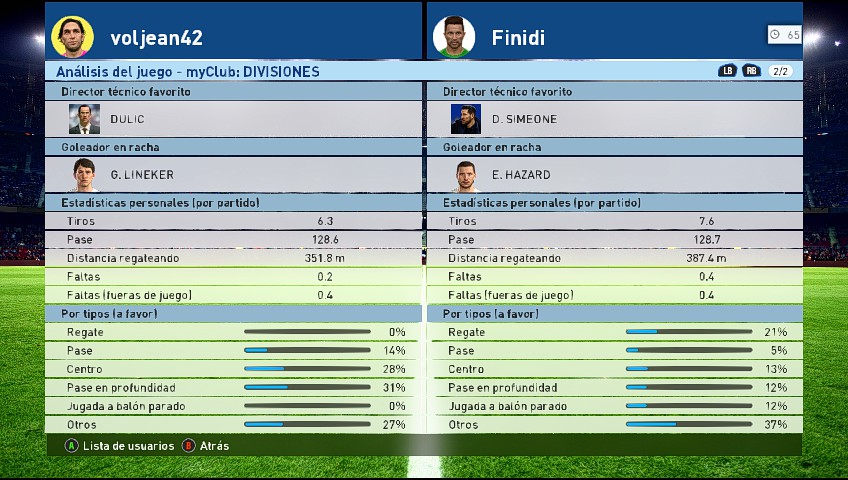 . Lo de la fluidez si que lo noto un poco cuando veo algunos videos de youtube, ahora, no sé si influirá mucho a la hora de la jugabilidad, yo si la conexión va bien no tengo ningún problema en jugar en la ps3. Y ojalá volvamos a coincidir @higinio5555 para la revancha, me pillaste con el equipo " B ", a ver si con el " A " te puedo hacer frente, la verdad es que tuviste el control del partido todo el tiempo. Y @mokiPES , que bueno sería terminar mi etapa de Pes en ps3 que enfrentarme al number 1 del ranking, quiero ver como se las gasta el que va primero en el ranking