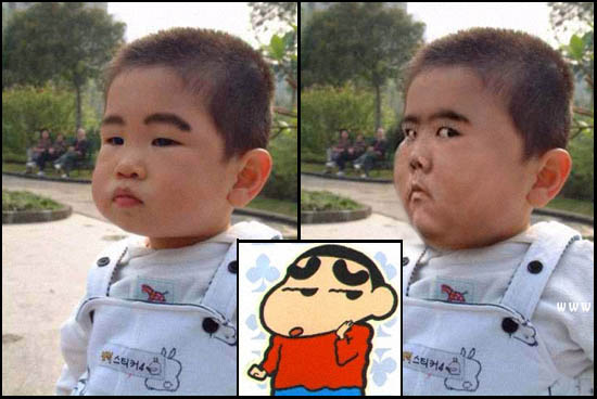 Yo uso de fondo la imagen original, en una capa la cabeza del chino, con tono/saturacion le puedes cambiar el color de la cara, depende si el cambio tiene q ser muy drastico...