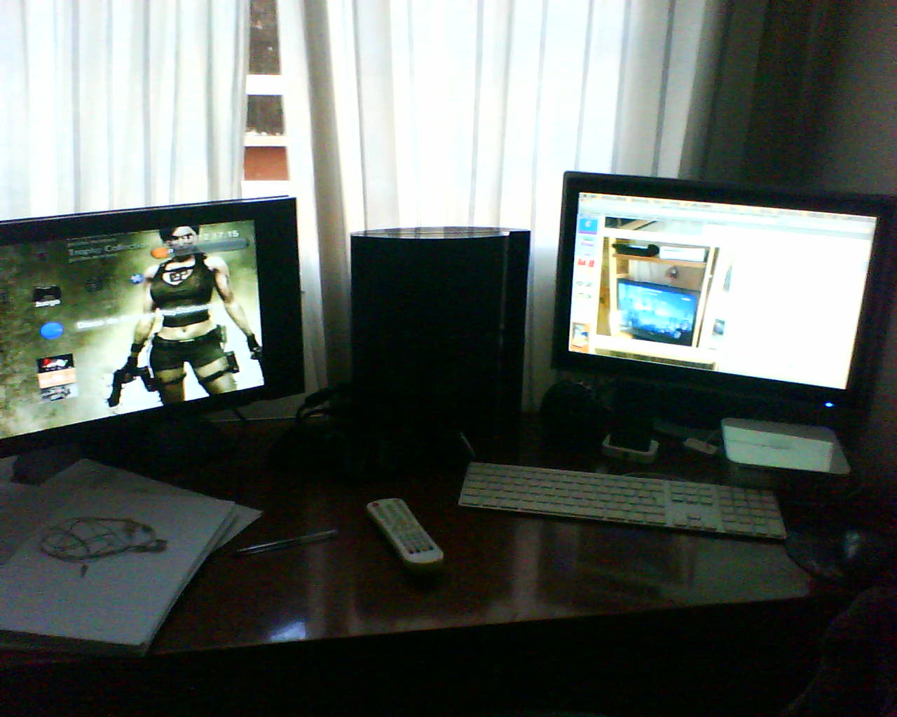 Otra PSP Slim 2000 conectada por AV a la Television, Dos portatiles uno HP y otro Acer, pentium 4 y D respectivamente con 3 y 4 GB de RAM y disco duro de 80 y 320 GB, el poratil mas nuevo con lectora de blue-ray y regrabadora de dvd COMBO y salida de video con HDMI conectada a la Television, el viejo esta por RGB. El PC que aparece en pantalla tiene 4GB de RAM, Grafia ATI 9600 Pro con salida de video HDMI que tambien esta concetada a la Television, Targeta de Sonido SoundBlaster 7.1 que esta conectada mediante un MiniJack a la Television para tener salida de audio digital que quito y pongo dependiendo del PC que use. Aunque tambien lo tengo conectado a unos alatavoces Creative 5.1. A la Television la tengo conectado un XtremeMac ExtremeHD HDMI Switcher Review (Multipuertos HDMI).