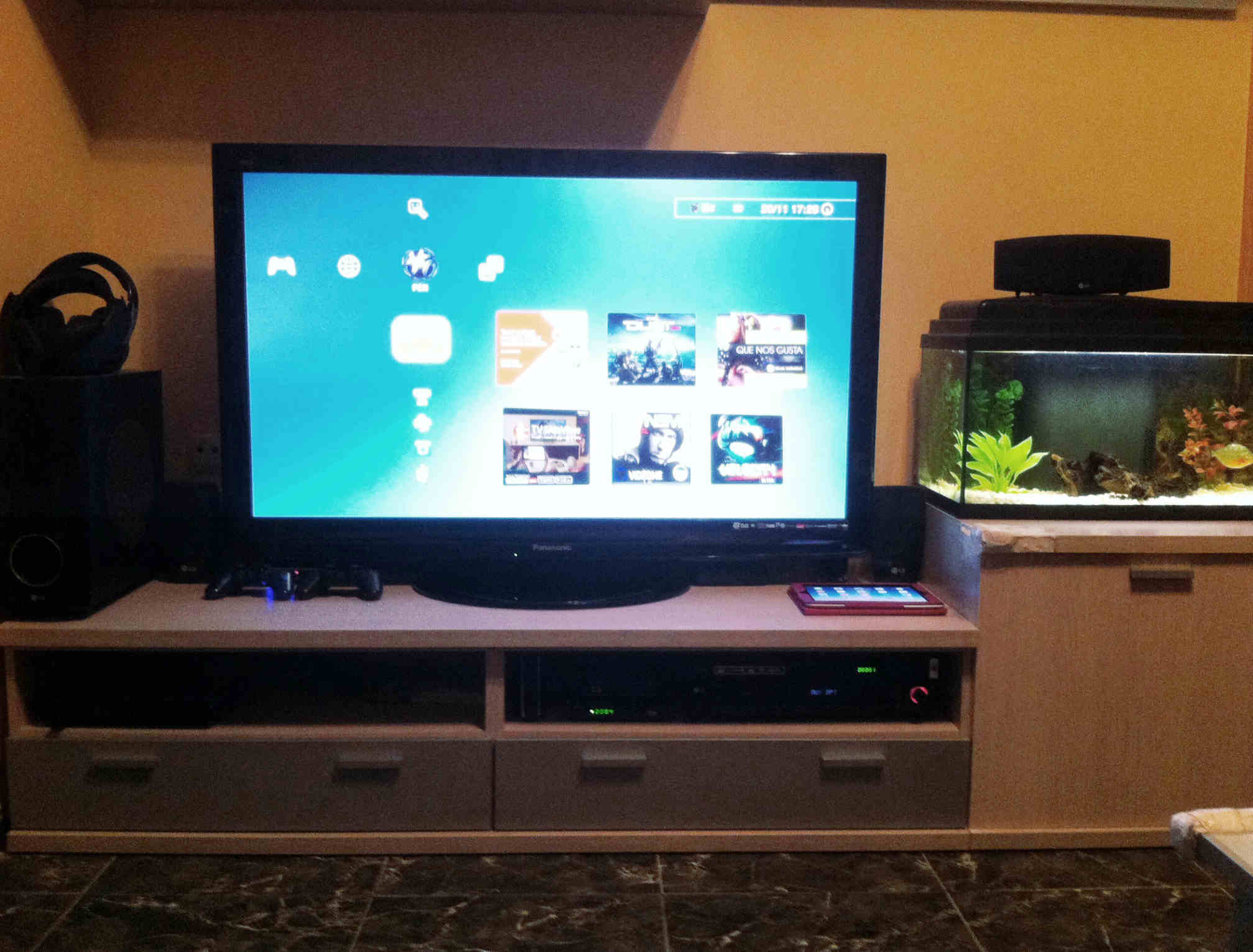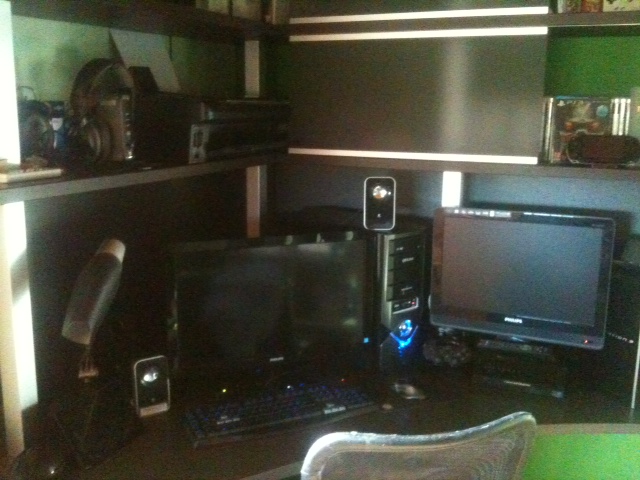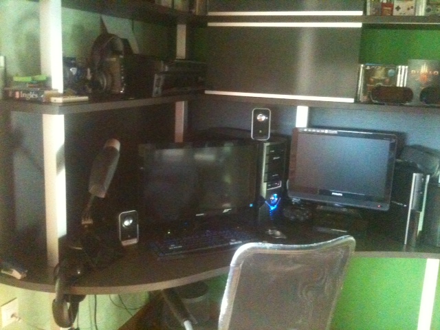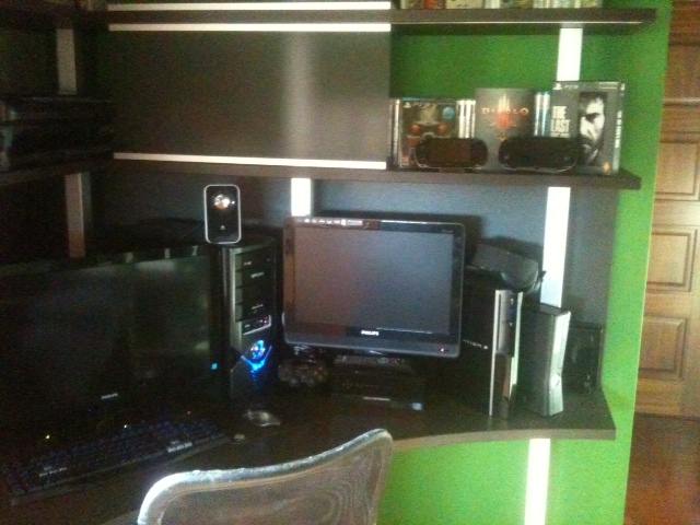 Yo tengo un mueble colgado de la pared trasera debajo del proyector. Tengo un proyector Optoma HD20 full hd 1080p que es el niño de mis ojos conectado a un 5.1 de sony. Me lo compré hace unos 4 años y la verdad que solo ha hecho que darme alegrias y 0 problemas. Me saca una imagen de 100 pulgadas y es una autentica flipada jugar y ver peliculas. No os pongo foto porque para que se vea en todo su esplendor tienen que estar todas las luces apagadas y no se aprecia el tamaño de la imagen que es lo que cuenta. Venga que ya queda muy poco!!!!!!!