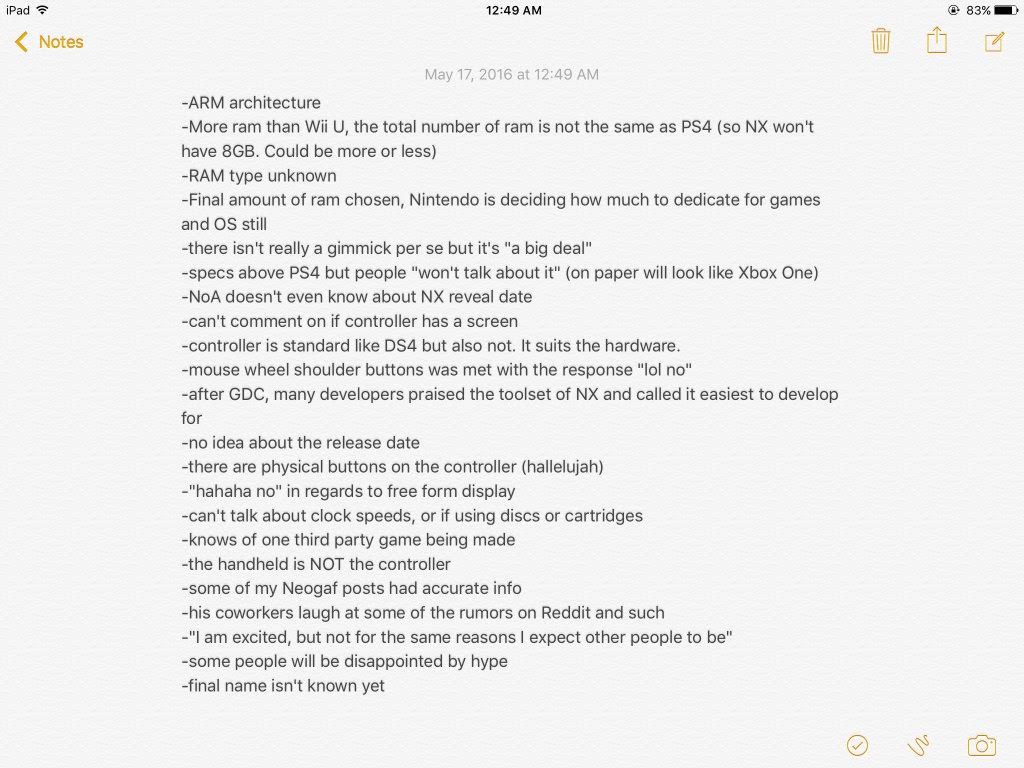 En términos de potencia neta, muchas fuentes me han hablado que la NX estará más cerca de Xbox One que de PS4. Aunque sea podría estar exagerando un poco. Cualquier persona que afirme que NX será el doble de potente que la PS4 está siendo engañada por sus fuentes. Basandome en lo que he oido, no creo que NX vaya a competir en potencia gráfica con PS4 Neo.