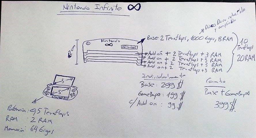 La cual tendría un control llamado Game Boy que te lo puedes llevar para seguir jugando donde quieras y que su base tiene una potencia de 2 Teraflops, pero que nintendo vende aparte add ons que puedes encajar con la base a manera de pisos para aumentar su potencia y su memoria; es decir compras el combo de control y base de 2 Teraflops de potencia y 1 Tera de memoria donde puedes ir comprando add ons que aumentarían por decir 1 teraflops por "piso" y 500 gigas de memoria; así podrías tener una consola virtualmente infinita es su capacidad de ampliar su potencia con un "piso" más.................