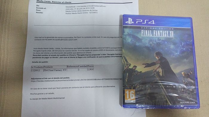 "Buenos días, por un error informático, se ha producido un error manifiesto en el precio del juego para PS4 FINAL FANTASY XV. El precio correcto es 17.99€. Por lo que procedemos a cancelar su reserva. Ruego disculpe las molestias.