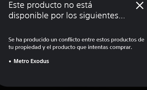 ManuSM10 escribió:Me tiene muy muy muy cabreado Sony y no es la 1 vez que me ha pasado algo similar, se que Metro Exodus esta de oferta por 5 o 6 euros pero no hay manera que pueda comprarlo. Me sale este mensaje y nada. Asi que por mi parte si no se arregla han perdido mi compra