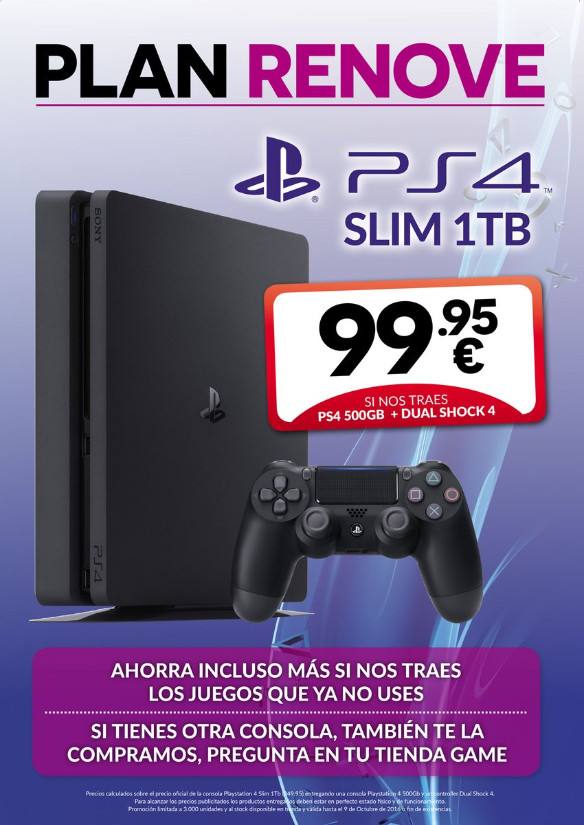 Opcion 1: consola vieja por consola nueva por 100 euros. Valor consola vieja: 250. Renove