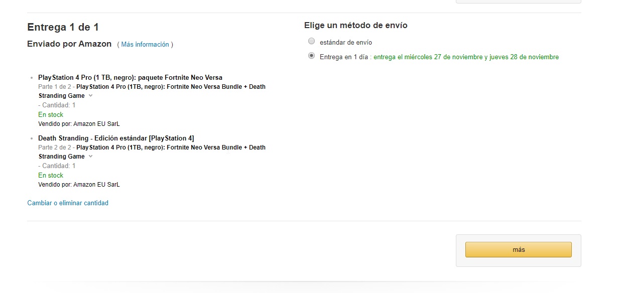 PS4 Pro 1TB Fortnite + Death Stranding (entiendo que código descargable, porque ni papa de alemán), por 299€.