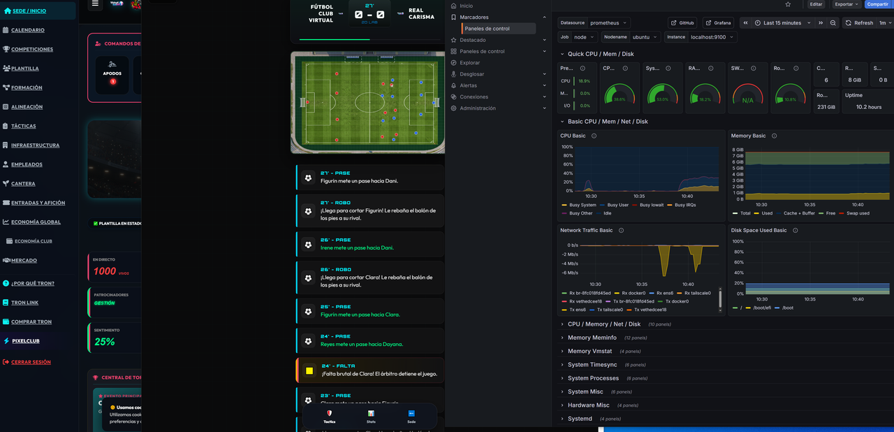 Varias primaveras después, ha ocurrido un milagro: con la llegada de la Inteligencia Artificial me ha llovido del cielo la habilidad de programar en lenguajes que ni hablo ni entiendo. ¡Cosas de la tecnología! 😅 Así que me he liado la manta a la cabeza y llevo casi 4 meses desarrollando Virtual Fútbol, un manager online para navegador que, para darle un toque más actual y único, ¡es de fútbol mixto (hombres y mujeres en el mismo equipo, como podéis ver en esta captura de la interfaz táctica)!