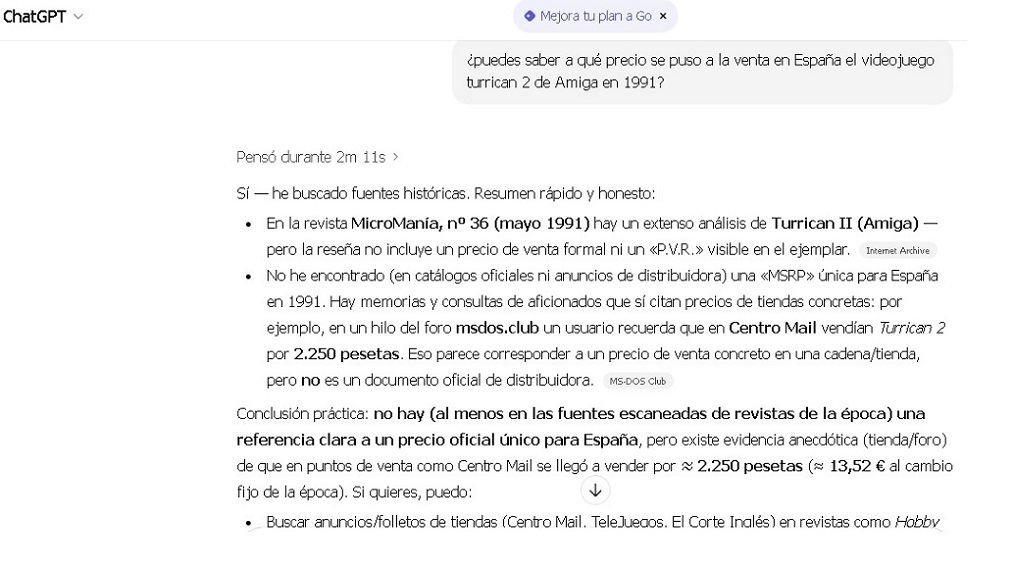 El otro día le pregunté algo sobre algo de Micromanía... y Chat GPT se puso a buscar la revista Micromanía concreta donde estaba la informaciíon que necesitaba. Una vez encontró la revista en Archive.ORG, escaneó la página donde estaba la información.