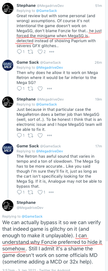 Had this Twitter convo with Stephane who is listed as Z80 programmer on Paprium. This pretty much confirms that Fonzie purposely locked out the Mega Sg. I like how he first tells me not to blame Fonzie for doing that when, if fact, he did do that. I wonder if Analogue can bypass Fonzie's detection. If not, the game could never be playable on the Mega Sg even if it reproduced it perfectly.
