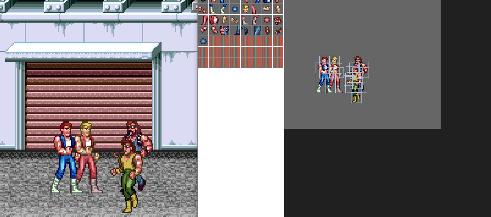 Resulta que los que desarrollaron este Double Dragon II para PC-Engine, se les ocurrió la "brillante" idea de separar los sprites de los personajes por parte del cuerpo... intuyo que para ahorrar espació de memoria, no teniendo que dibujar (y almacenar) una ristra de frámeas para cada sprite y si moviendo estas partes individualmente. Absurdo, pues estamos ante un videojuego lanzado en CD, y espacio tenían de sobra... ¿Falta de RAM quizá? Puede ser, porque veo que estos "genios" cargan prácticamente el nivel completo en la memoria de video.
