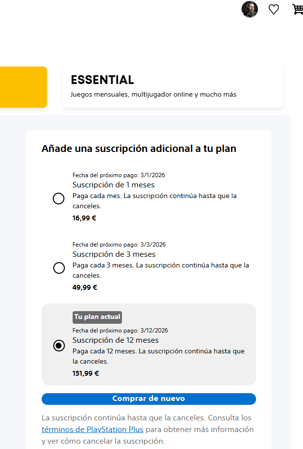 Yo tenía la suscripción mensual de Essential que me vencía el 11 de diciembre (fuera del periodo de descuento por BF). Con suscripción mensual y descuento por la parte del mes restante solo me dejaba si subía a Premium, pero no a extra. Ni para el Extra ni para el Premium me daba la opción de 12 meses, sin embargo para el Essential sí y con el descuento del 20%. Total, que he ampliado la suscripción de mensual a anual del Essential con el descuento del 20%.
