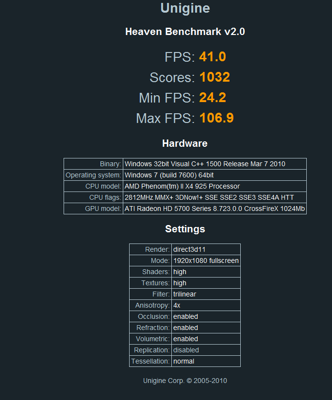 Metro 2033 en DX10 Very High 1440x900 muy fluido. Si lo pongo en DX11 tengo que bajarlo a High y quitar la profundidad de campo del dx11 (Dof). Sin contar que este juego ni siquiera esta optimizado para Ati, solo para Nvidia.
