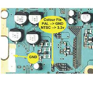 Esto esta por la cara de atras de la placa, lo unico k tienes k hacer es soldar un puente desde el punto colour-fix hasta cualkier punto de masa, ya sea el indicado o el k tu kieras.