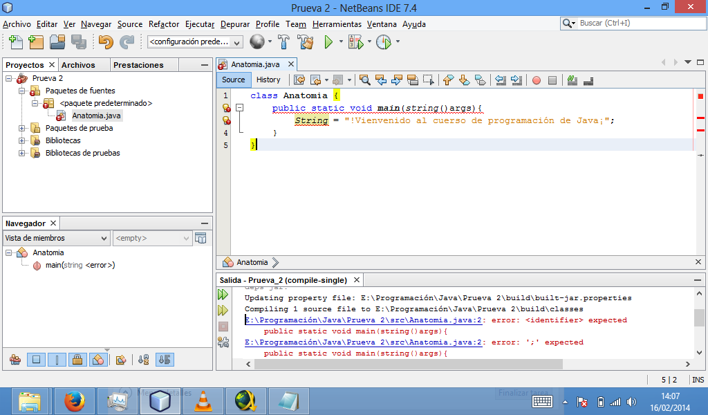 class Anatomia { public static void main(string() args) { String = "!Vienvenido al cuerso de programación de Java¡"; } }